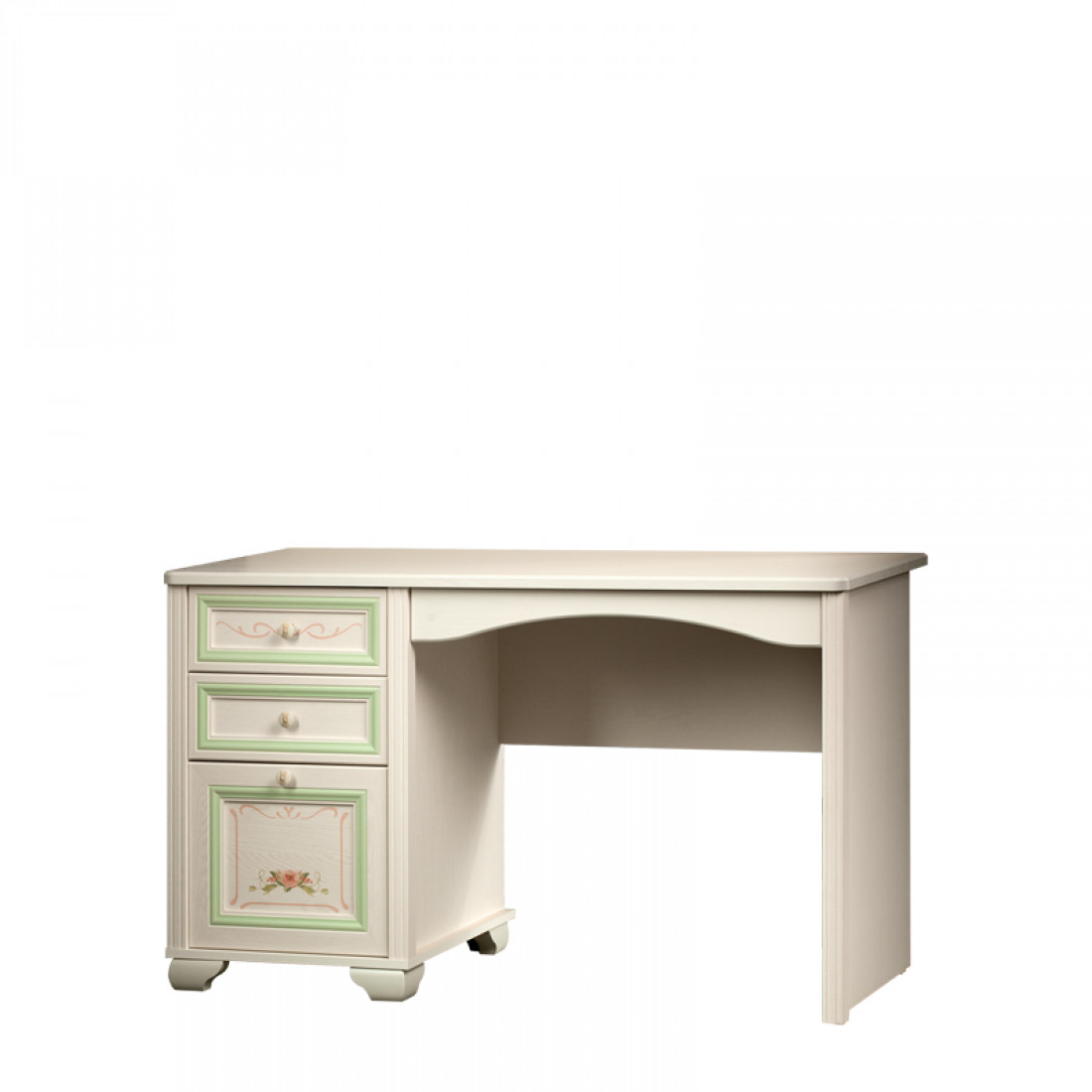 Золотистые ручки с белой патиной подчеркивают классический стиль мебели