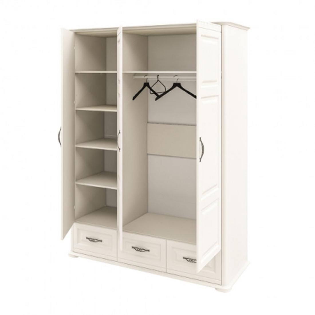 Роскошный трехстворчатый шкаф для одежды и белья МН-126-03(1) в спальню новой серии Марсель (Мебель-Неман) выполнен в светлом кремовом оттенке является настоящим подарком производителя. Купить шкаф можно для комплекта полного спального гарнитура Марсель с другими элементами серии или отдельно.